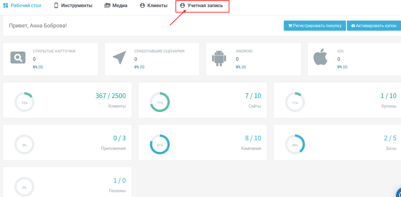 Описание функционала вкладок "Учетная запись"