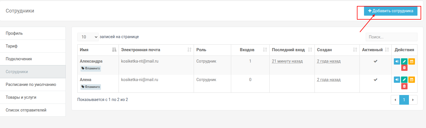 Во кладке "Сотрудники" будут отображаться сотрудники, занесенные Владельцем учетной записи. Добавления "сотрудников" необходимо если Владелец учетной записи планирует передать право для ведения Маркетинговой компании специальному сотруднику (Маркетолог, Консультант, Менеджер) или при создании виджета на сайте "Онлайн запись" для Салонов красоты, Медицинских центров и т.д.