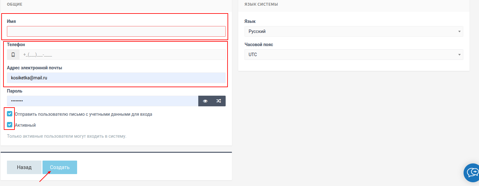 Далее осуществляем переход во вкладку "Сотрудник/Добавить сотрудника", заполняем поля "Имя", "Телефон", "Адрес электронной почты", выбираем галочки "Отправить пользователю письмо с учетными данными для входа" и "Активный" и нажимаем кнопку "Создать" внизу экрана.