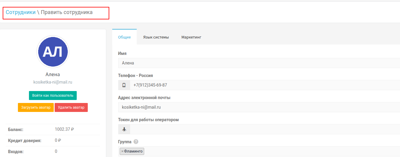 Во кладке "Сотрудники/Править сотрудника" во вкладке "Общее" можно редактировать поля "Имя", Телефон", "Адрес электронной почты" и "Пароль" сотрудника . Добавить "Токен для работы оператора", а также назначить "Группу" для сотрудника.